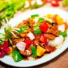 200grams de boeuf sauté avec des légumes en sauce de piment, ail, oignon, cacahuèttes, sésames. Servi sans acompagement