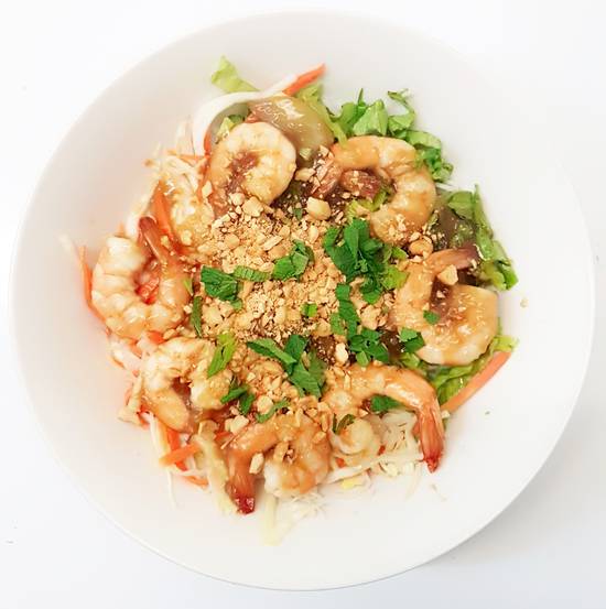 vermicelles de riz,crevettes sauté, salade, cacahuettes et herbes aromatiques