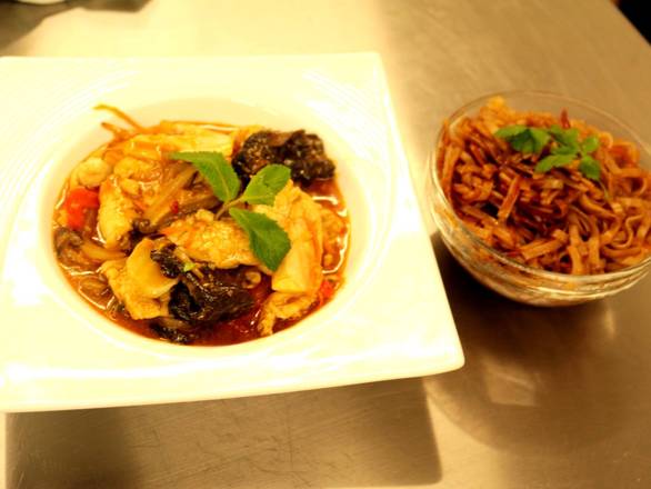 200grams de blanc de poulet sauté avec du piment, de l’ail, de cacahuettes et sesames avec des legumes et de l’ananas de saison. Servi sans accompagement